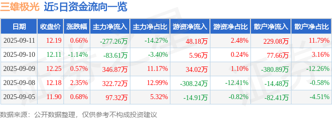 9月11日的资金流向数据方面,主力资金净流出277.26万元,占总成交额14.27%,游资资金净流入48.18万元,占总成交额2.48%,散户资金净流入229.08万元,占总成交额11.79%。