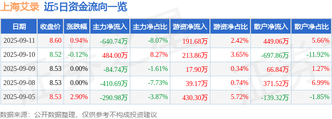 证券之星消息,截至2025年9月11日收盘,上海艾录(301062)报收于8.6元,上涨0.94%,换手率3.0%,成交量9.34万手,成交额7935.43万元。
