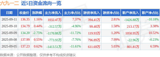 证券之星消息,截至2025年9月11日收盘,六九一二(301592)报收于136.35元,上涨1.16%,换手率5.92%,成交量1.04万手,成交额1.4亿元。