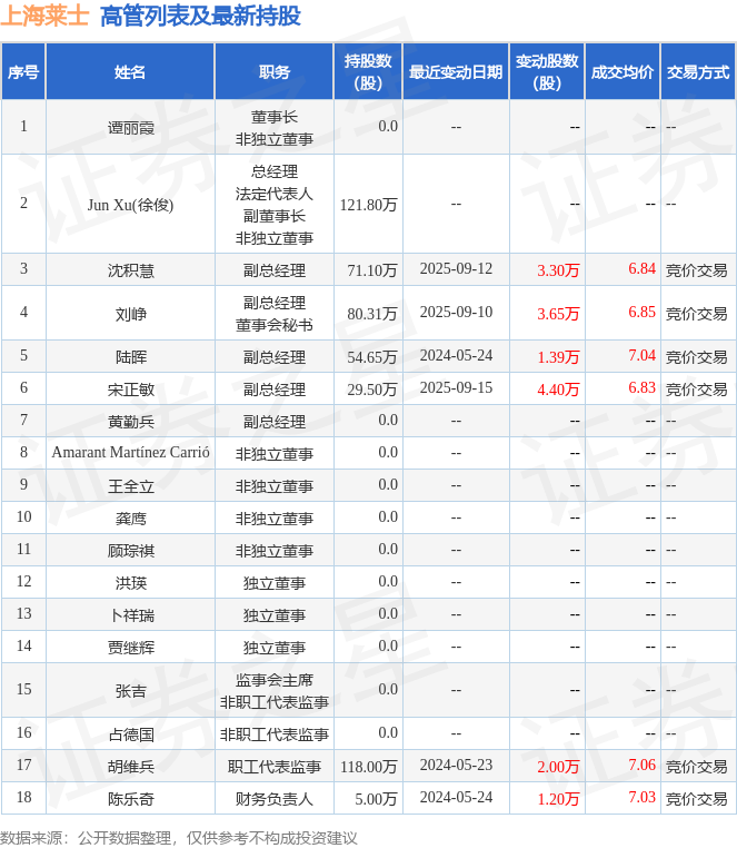 证券之星消息,根据9月11日市场公开信息、上市公司公告及交易所披露数据整理,上海莱士(002252)最新董监高及相关人员股份变动情况:2025年9月10日公司董秘,高管刘峥共增持公司股份3.65万股,占公司总股本为0.0005%。变动期间公司股价下跌0.44%,9月10日当日收盘报6.83元。