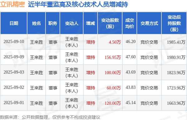 证券之星消息,根据9月11日市场公开信息、上市公司公告及交易所披露数据整理,立讯精密(002475)最新董监高及相关人员股份变动情况:2025年9月10日公司董事王来胜共增持公司股份4.5万股,占公司总股本为0.0006%。变动期间公司股价上涨0.8%,9月10日当日收盘报48.09元。