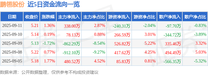证券之星消息,截至2025年9月11日收盘,鹏翎股份(300375)报收于5.21元,上涨1.36%,换手率4.54%,成交量22.95万手,成交额1.18亿元。