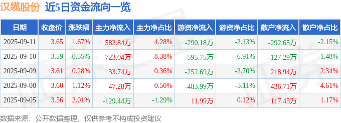 证券之星消息,截至2025年9月11日收盘,汉缆股份(002498)报收于3.65元,上涨1.67%,换手率1.13%,成交量37.58万手,成交额1.36亿元。