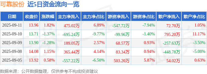证券之星消息,截至2025年9月11日收盘,可靠股份(301009)报收于13.96元,上涨1.82%,换手率3.32%,成交量5.01万手,成交额6894.69万元。