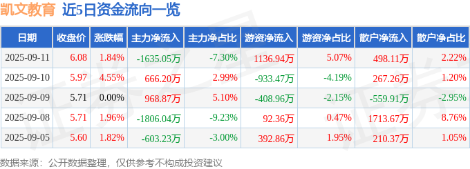 证券之星消息,截至2025年9月11日收盘,凯文教育(002659)报收于6.08元,上涨1.84%,换手率6.28%,成交量37.55万手,成交额2.24亿元。