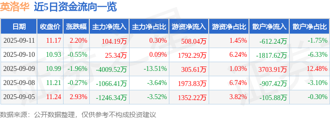 9月11日的资金流向数据方面,主力资金净流入104.19万元,占总成交额0.3%,游资资金净流入508.04万元,占总成交额1.45%,散户资金净流出612.24万元,占总成交额1.75%。