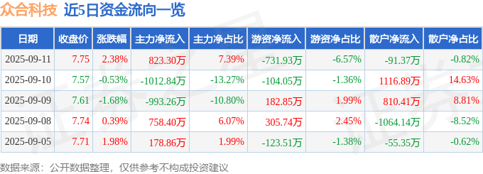 证券之星消息,截至2025年9月11日收盘,众合科技(000925)报收于7.75元,上涨2.38%,换手率2.17%,成交量14.58万手,成交额1.11亿元。
