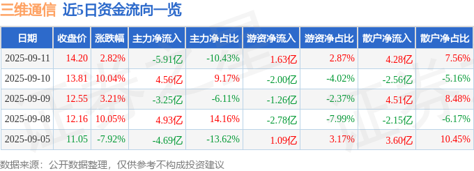 证券之星消息,截至2025年9月11日收盘,三维通信(002115)报收于14.2元,上涨2.82%,换手率53.05%,成交量399.05万手,成交额56.62亿元。