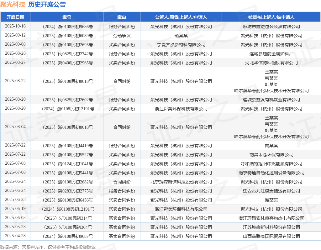 案号:(2025)浙0108民初6089号根据统计,近一年内以聚光科技(杭州)股份有限公司为当事人的历史开庭公告有50则,其中案由为“买卖合同纠纷”的公告以25则居首,其次为“服务合同纠纷”有17则,“合同纠纷”有5则。历史开庭公告(前20条)如下: