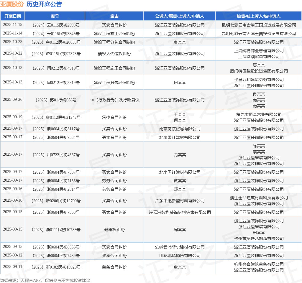 案号:(2025)浙0604民初7489号根据统计,近一年内以浙江亚厦装饰股份有限公司为当事人的历史开庭公告有544则,其中案由为“买卖合同纠纷”的公告以169则居首,其次为“劳务合同纠纷”有107则,“建设工程施工合同纠纷”有66则。历史开庭公告(前20条)如下: