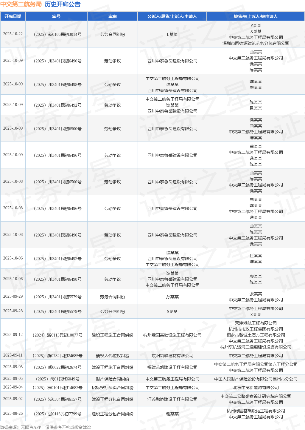 案号:(2024)浙0113民初10077号根据统计,近一年内以中交第二航务工程局有限公司为当事人的历史开庭公告有254则,其中案由为“建设工程施工合同纠纷”的公告以63则居首,其次为“买卖合同纠纷”有27则,“劳务合同纠纷”有26则。历史开庭公告(前20条)如下: