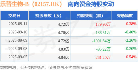 证券之星消息,9月11日南向资金增持179.9万股乐普生物-B(02157.HK)。近5个交易日中,获南向资金减持的有3天,累计净减持932.48万股。近20个交易日中,获南向资金增持的有14天,累计净增持2164.12万股。截至目前,南向资金持有乐普生物-B(02157.HK)4.72亿股,占公司已发行普通股的26.15%。