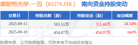 证券之星消息,9月11日南向资金增持111.44万股康耐特光学-一百(02276.HK)。截至目前,南向资金持有康耐特光学-一百(02276.HK)565.51万股,占公司已发行普通股的1.17%。