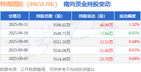证券之星消息,9月11日南向资金增持46.9万股特海国际(09658.HK)。近5个交易日中,获南向资金增持的有4天,累计净增持105.87万股。近20个交易日中,获南向资金增持的有13天,累计净增持109.52万股。截至目前,南向资金持有特海国际(09658.HK)3596.65万股,占公司已发行普通股的5.52%。