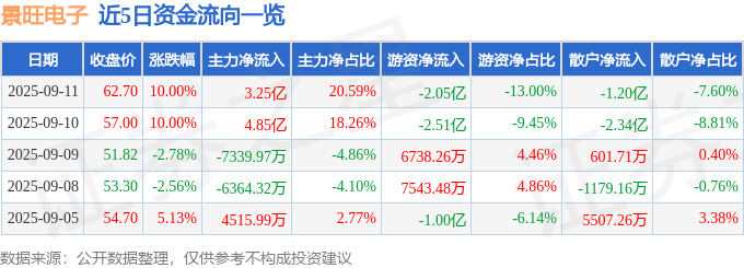 证券之星消息,截至2025年9月11日收盘,景旺电子(603228)报收于62.7元,上涨10.0%,已连续涨停2天,换手率2.72%,成交量25.37万手,成交额15.78亿元。