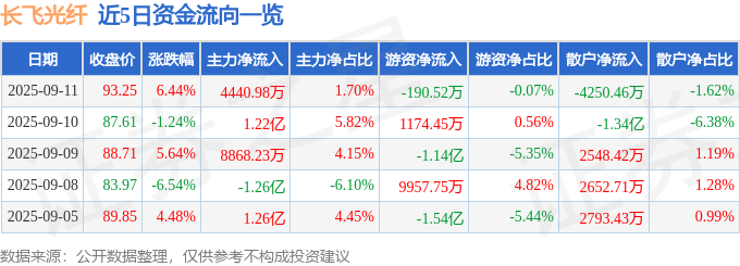 证券之星消息,截至2025年9月11日收盘,长飞光纤(601869)报收于93.25元,上涨6.44%,换手率7.02%,成交量28.52万手,成交额26.16亿元。