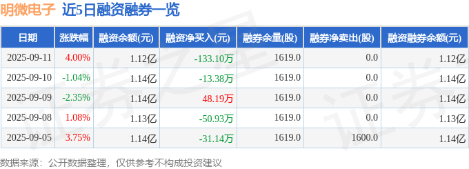 明微电子融资融券信息显示,融资方面,当日融资买入458.18万元,融资偿还591.28万元,融资净偿还133.1万元。融券方面,融券卖出0.0股,融券偿还0.0股,融券余量1619.0股,融券余额6.1万元。融资融券余额1.12亿元。