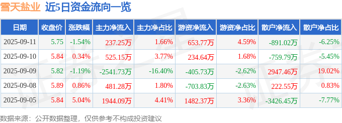 证券之星消息,截至2025年9月11日收盘,雪天盐业(600929)报收于5.75元,下跌1.54%,换手率1.51%,成交量24.82万手,成交额1.43亿元。