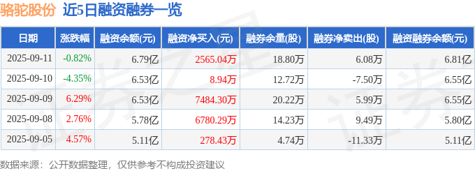 证券之星消息,截至2025年9月11日收盘,骆驼股份(601311)报收于10.9元,下跌0.82%,换手率5.72%,成交量67.06万手,成交额7.26亿元。