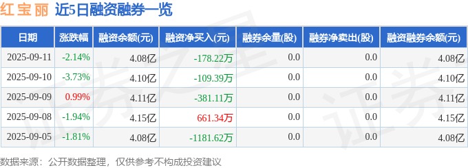 红 宝 丽融资融券信息显示,融资方面,当日融资买入5815.21万元,融资偿还5993.43万元,融资净偿还178.22万元。融券方面,融券卖出0.0股,融券偿还0.0股,融券余量0.0股,融券余额0.0万元。融资融券余额4.08亿元。