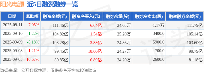 阳光电源融资融券信息显示,融资方面,当日融资买入33.1亿元,融资偿还26.46亿元,融资净买入6.64亿元,净买入额两市排名第7,连续3日净买入累计12.01亿元。融券方面,融券卖出3200.0股,融券偿还1.49万股,融券余量24.03万股,融券余额3300.83万元。融资融券余额111.79亿元。