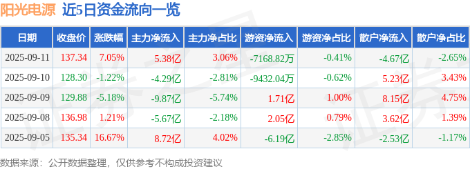 证券之星消息,截至2025年9月11日收盘,阳光电源(300274)报收于137.34元,上涨7.05%,换手率8.47%,成交量134.67万手,成交额176.01亿元。