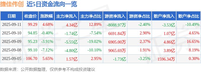 证券之星消息,截至2025年9月11日收盘,捷佳伟创(300724)报收于99.29元,上涨4.68%,换手率11.99%,成交量34.43万手,成交额33.67亿元。
