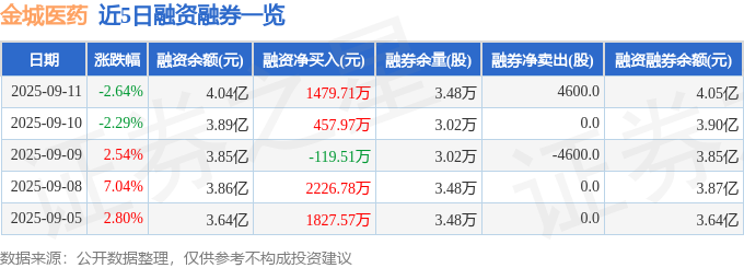 金城医药融资融券信息显示,融资方面,当日融资买入5074.34万元,融资偿还3594.63万元,融资净买入1479.71万元。融券方面,融券卖出4600.0股,融券偿还0.0股,融券余量3.48万股,融券余额70.71万元。融资融券余额4.05亿元。
