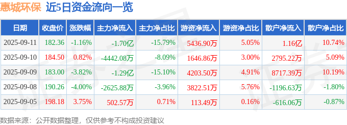 证券之星消息,截至2025年9月11日收盘,惠城环保(300779)报收于182.36元,下跌1.16%,换手率3.84%,成交量6.05万手,成交额10.76亿元。