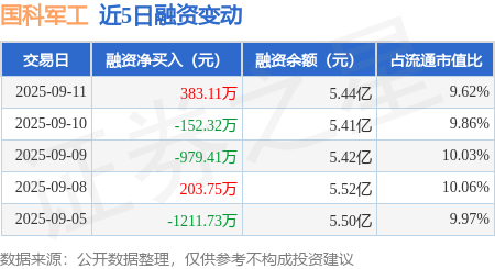 证券之星消息,9月11日,国科军工(688543)融资买入2826.01万元,融资偿还2442.9万元,融资净买入383.11万元,融资余额5.44亿元。