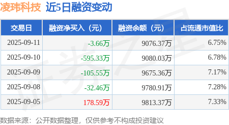 证券之星消息,9月11日,凌玮科技(301373)融资买入366.95万元,融资偿还370.61万元,融资净卖出3.66万元,融资余额9076.37万元。