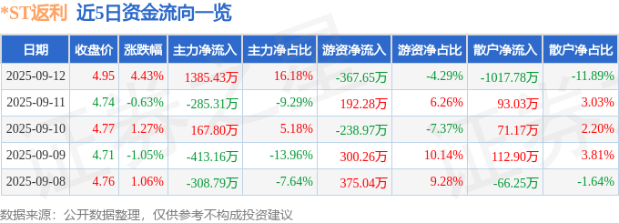 证券之星消息,截至2025年9月12日收盘,*ST返利(600228)报收于4.92元,上涨3.8%,换手率1.93%,成交量8.03万手,成交额3886.32万元。