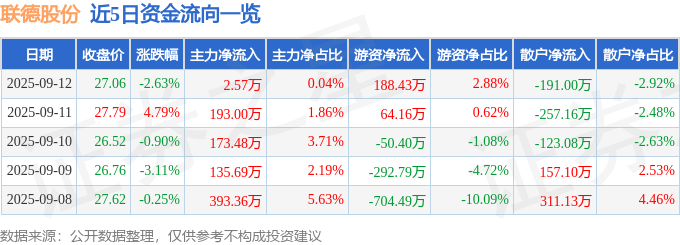 证券之星消息,截至2025年9月12日收盘,联德股份(605060)报收于27.16元,下跌2.27%,换手率0.83%,成交量2.0万手,成交额5445.13万元。