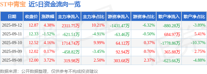 证券之星消息,截至2025年9月12日收盘,ST中青宝(300052)报收于12.85元,上涨4.22%,换手率5.66%,成交量14.81万手,成交额1.92亿元。