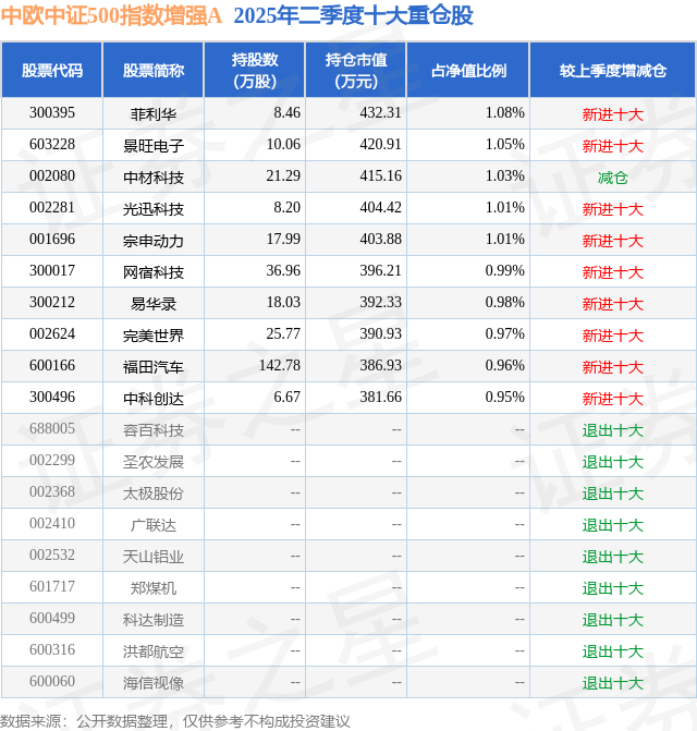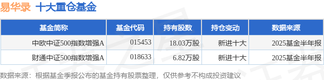 根据2025基金半年报公募基金重仓股数据,重仓该股的公募基金共2家,其中持有数量最多的公募基金为中欧基金的中欧中证500指数增强A。中欧中证500指数增强A目前规模为2.13亿元,最新净值1.3105(9月11日),较上一交易日上涨2.63%,近一年上涨70.79%。该公募基金现任基金经理为钱亚婷 宋婷。钱亚婷在任的基金产品包括:中欧互通精选混合A,管理时间为2021年11月3日至今,期间收益率为-1.74%;中欧沪深300指数增强A,管理时间为2022年3月29日至今,期间收益率为12.31%;中欧小盘成长混合A,管理时间为2022年6月28日至今,期间收益率为53.25%。宋婷在任的基金产品包括:中欧金安量化混合A,管理时间为2025年4月2日至今,期间收益率为25.44%;中欧中证1000指数增强A,管理时间为2025年6月5日至今,期间收益率为20.54%;中欧国证2000指数增强A,管理时间为2025年6月17日至今,期间收益率为16.24%。