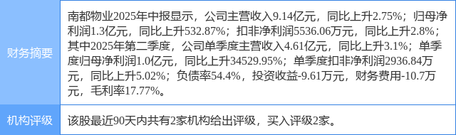 2025年8月28日,开源证券研究员齐东,胡耀文,杜致远发布了对南都物业的研报《公司信息更新报告:营收利润同比增长,机器人投资“研发+应用”生态协同》,该研报对南都物业给出“买入”评级。研报中预计公司2025-2027年归母净利润分别为1.68、1.76、1.84亿元,EPS分别为0.89、0.94、0.98元,当前股价对应PE为16.1、15.3、14.7倍,我们认为公司在退出亏损项目后轻装上阵,盈利能力有望修复,维持“买入”评级。证券之星数据中心根据近三年发布的研报数据计算,该研报作者对此股的盈利预测准确度为59.04%。