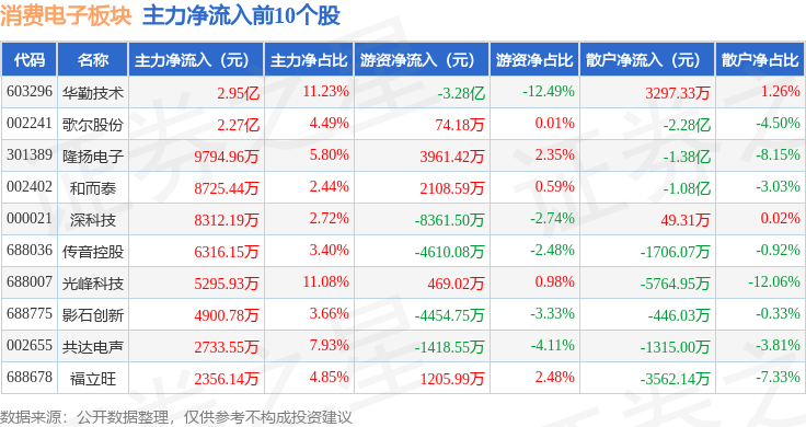 从资金流向上来看,当日消费电子板块主力资金净流出52.03亿元,游资资金净流入11.45亿元,散户资金净流入40.58亿元。消费电子板块个股资金流向见下表: