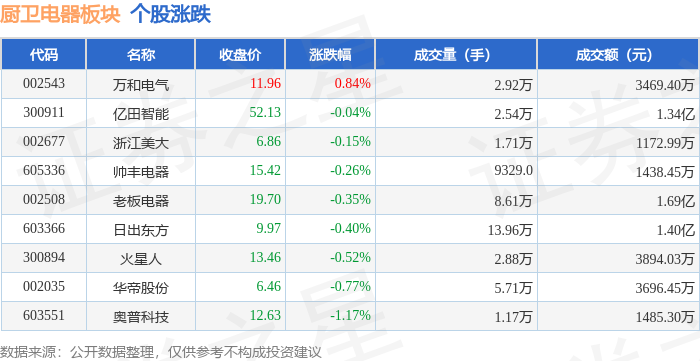 证券之星消息,9月12日厨卫电器板块较上一交易日下跌1.38%,奥普科技领跌。当日上证指数报收于3883.69,上涨0.22%。深证成指报收于12996.38,上涨0.13%。厨卫电器板块个股涨跌见下表: