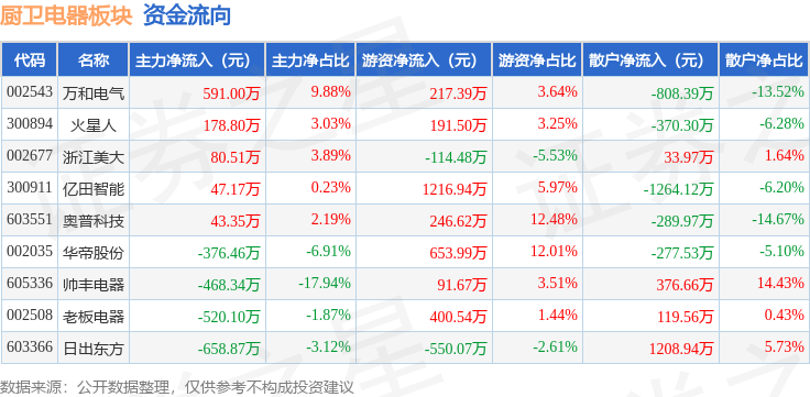 从资金流向上来看,当日厨卫电器板块主力资金净流出1082.93万元,游资资金净流入2354.1万元,散户资金净流出1271.16万元。厨卫电器板块个股资金流向见下表:
