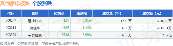 证券之星消息,9月12日其他家电板块较上一交易日下跌2.22%,荣泰健康领跌。当日上证指数报收于3883.69,上涨0.22%。深证成指报收于12996.38,上涨0.13%。其他家电板块个股涨跌见下表: