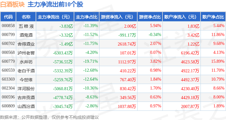 从资金流向上来看,当日白酒板块主力资金净流出13.07亿元,游资资金净流入2.5亿元,散户资金净流入10.57亿元。白酒板块个股资金流向见下表: