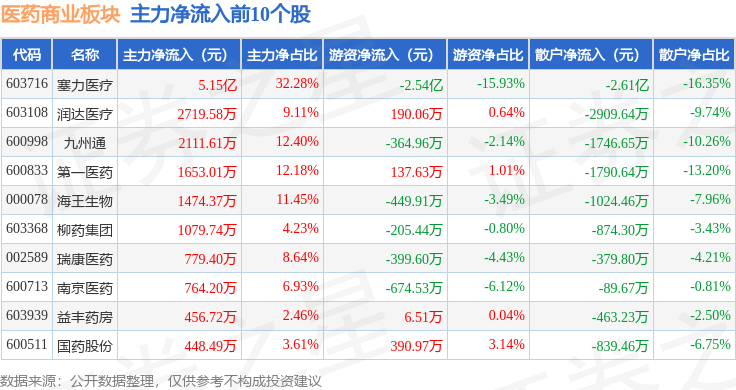 从资金流向上来看,当日医药商业板块主力资金净流入2.95亿元,游资资金净流出1.82亿元,散户资金净流出1.13亿元。医药商业板块个股资金流向见下表: