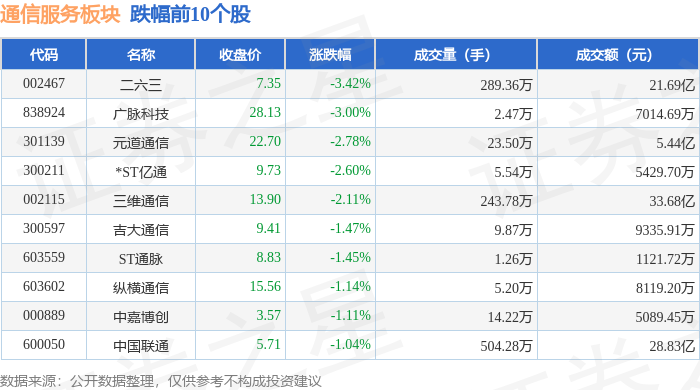 证券之星消息,9月12日通信服务板块较上一交易日下跌0.49%,二六三领跌。当日上证指数报收于3883.69,上涨0.22%。深证成指报收于12996.38,上涨0.13%。通信服务板块个股涨跌见下表: