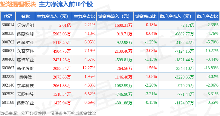 从资金流向上来看,当日盐湖提锂板块主力资金净流出17.42亿元,游资资金净流入6.87亿元,散户资金净流入10.55亿元。盐湖提锂板块个股资金流向见下表:
