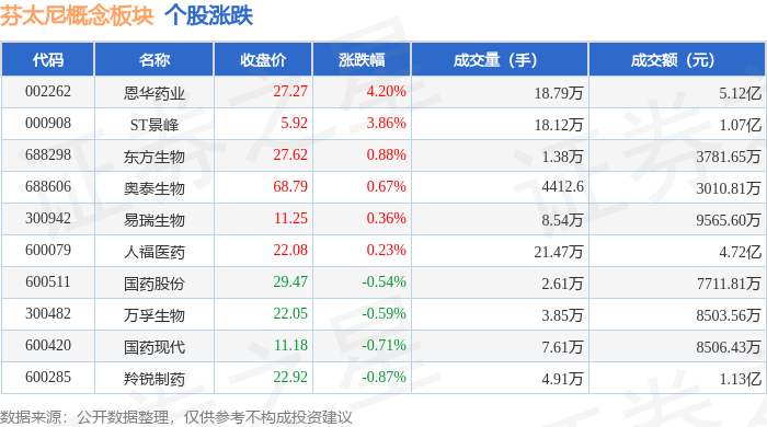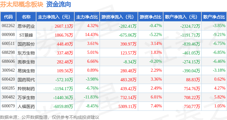 从资金流向上来看,当日芬太尼概念板块主力资金净流出3614.63万元,游资资金净流入6793.17万元,散户资金净流出3178.54万元。芬太尼概念板块个股资金流向见下表: