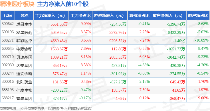 从资金流向上来看,当日精准医疗板块主力资金净流出2.35亿元,游资资金净流入2.73亿元,散户资金净流出3860.26万元。精准医疗板块个股资金流向见下表: