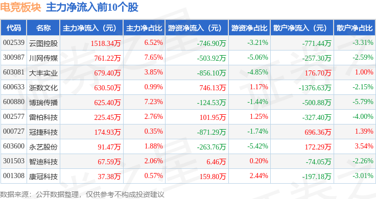 从资金流向上来看,当日电竞板块主力资金净流出11.02亿元,游资资金净流入1.19亿元,散户资金净流入9.83亿元。电竞板块个股资金流向见下表: