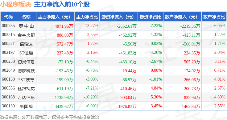 从资金流向上来看,当日小程序板块主力资金净流出8.97亿元,游资资金净流入5054.33万元,散户资金净流入8.46亿元。小程序板块个股资金流向见下表: