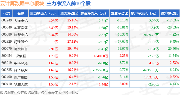 从资金流向上来看,当日云计算数据中心板块主力资金净流出62.36亿元,游资资金净流出2404.33万元,散户资金净流入62.6亿元。云计算数据中心板块个股资金流向见下表: