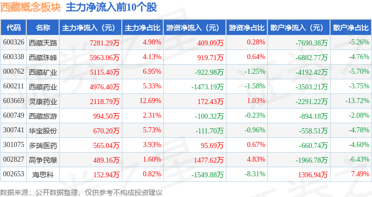 从资金流向上来看,当日西藏概念板块主力资金净流入6520.09万元,游资资金净流入5290.69万元,散户资金净流出1.18亿元。西藏概念板块个股资金流向见下表: